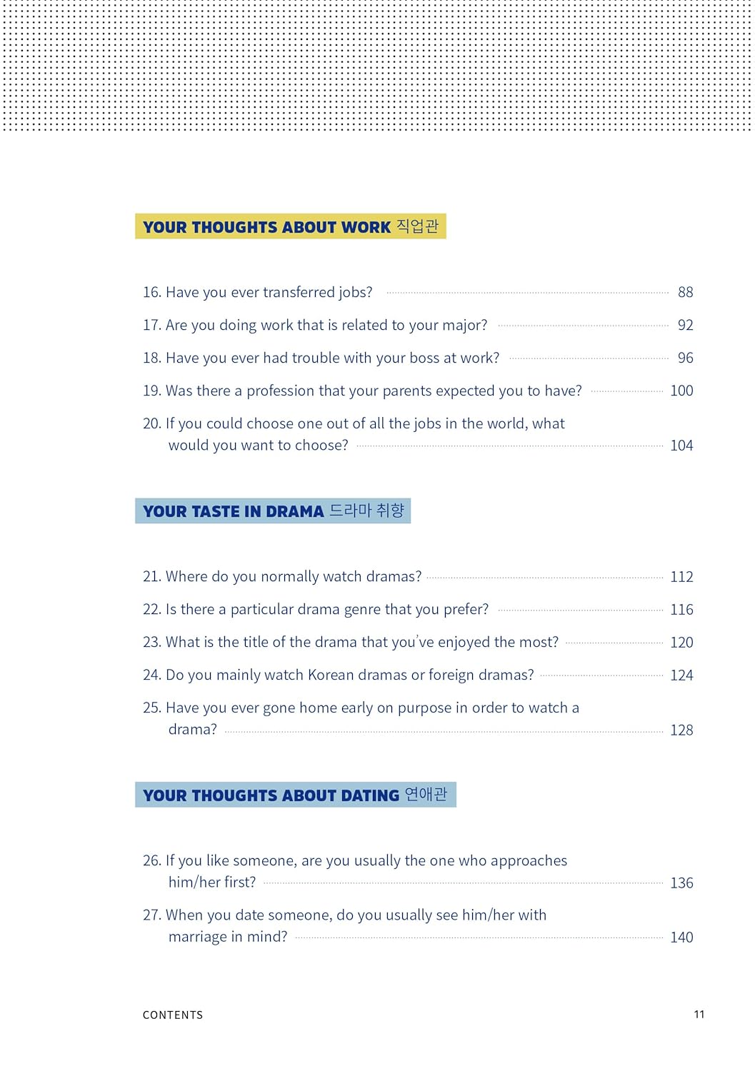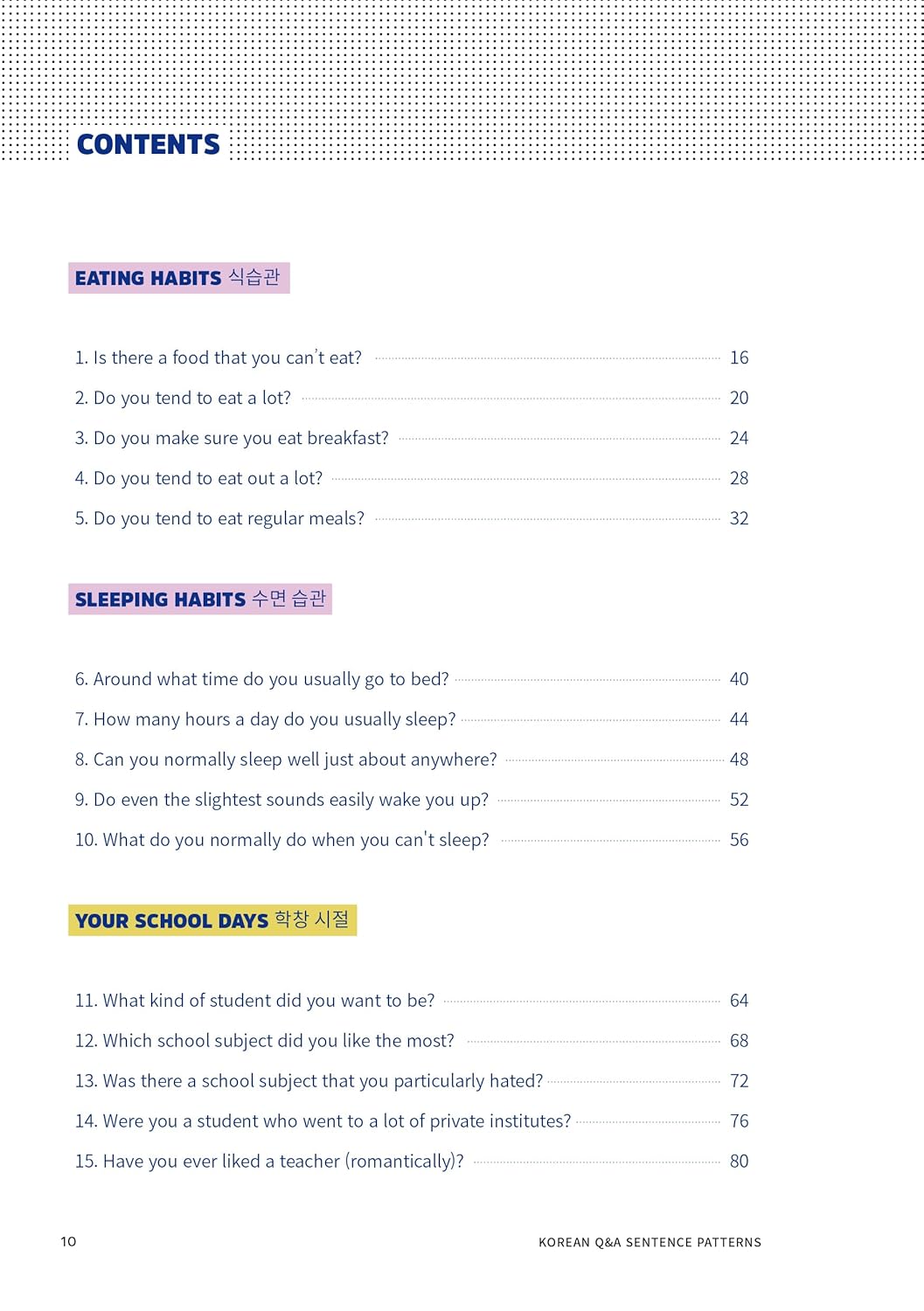 من خلال شرح مبسّط، وأمثلة واقعية، وتمارين تطبيقية، يساعد الكتاب الطلاب على تطوير مهاراتهم في المحادثة وتحسين قدرتهم على التواصل بثقة ووضوح. يُعد هذا الكتاب مناسبًا للمتعلمين في المستويات المبتدئة إلى المتوسطة الذين يرغبون في تعزيز طلاقتهم في اللغة الكورية عبر التدرّب على أنماط جمل فعّالة ومستخدمة بكثرة بين الناطقين الأصليين.