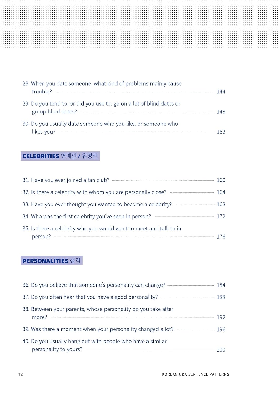 يقدّم كتاب "Korean Q&A Sentence Patterns" من منصة TTMIK منهجًا عمليًا ومباشرًا لتعلّم أهم أنماط الجمل في اللغة الكورية المستخدمة في صيغة السؤال والجواب. يركّز الكتاب على تعليم المتعلّم كيفية تكوين أسئلة طبيعية وبناء إجابات متنوعة باستخدام تراكيب لغوية شائعة في الحياة اليومية.