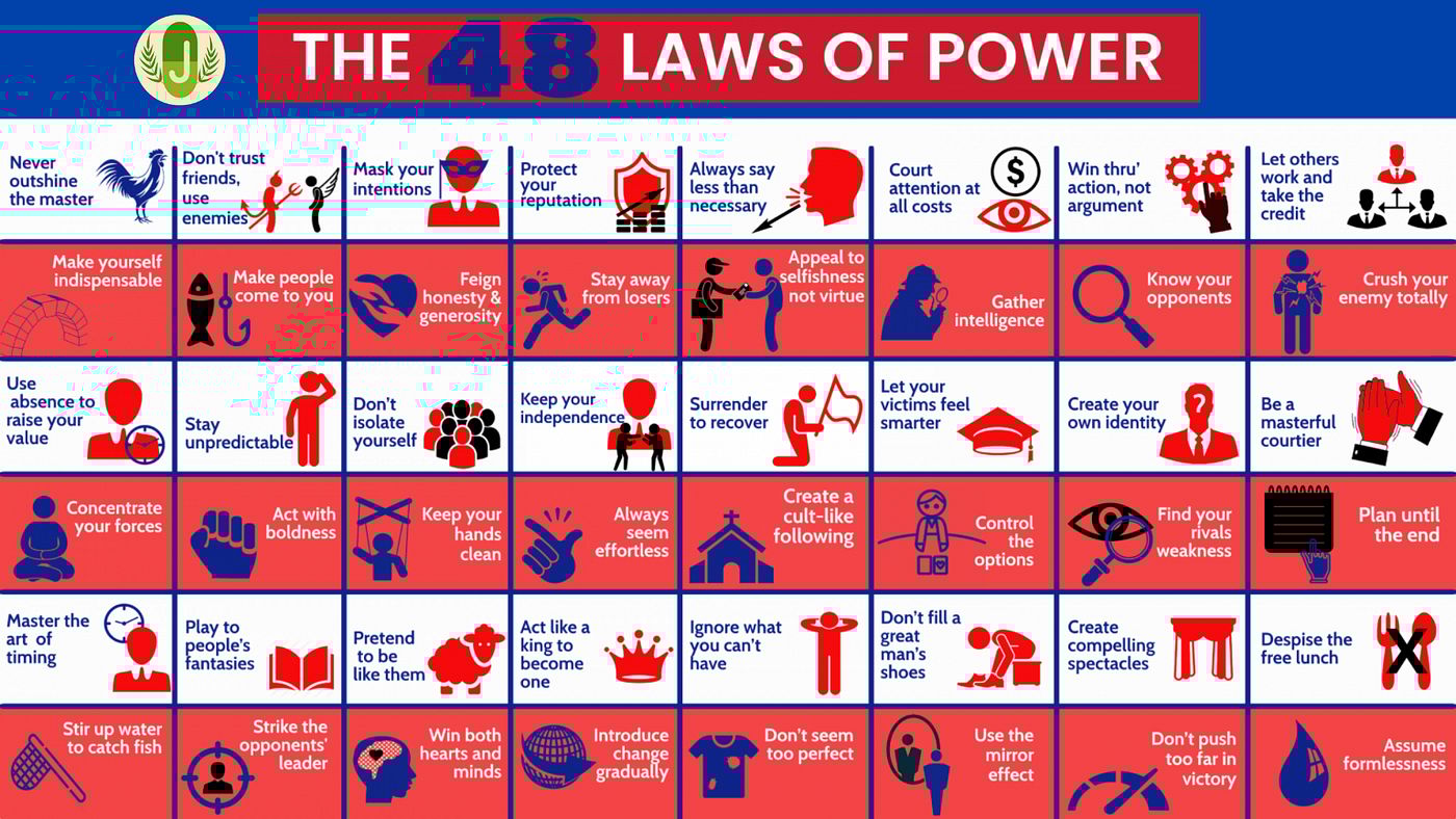 يقدّم الكتاب 48 قاعدة عملية مستمدة من التاريخ والسياسة وعالم الأعمال، تشرح كيف يمكن للسلطة أن تُكتسب، تُحافظ، أو تُفقد.